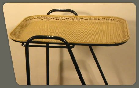description : stucture tubulaire métallique & tôle noire perforée, plateau inférieur fixe et réceptacle à bouteille, plateau supérieur amovible en tôle perforée laquée jaune