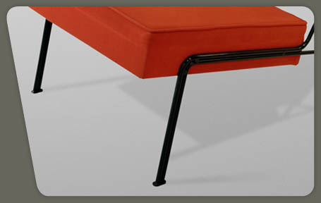 description : chauffeuses en mousse de latex recouvertes de leur tissu d'origine rouge orangé, structure métal laquée noire