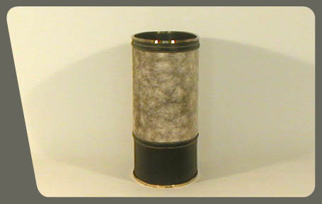 description : named "horse guard", made of metal covered with leatherette and foal skin, brass hoop on the top and bottom