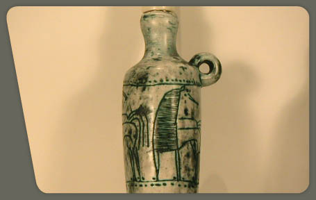 description : rare paire d'appliques néo-classique, évoque la céramique crétoise ancienne, faïence émaillée vert nuagé noir avec décor gravé en registre figurant des chevaux stylisés
