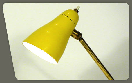 description : double function lighting, lamp and sconce, adjustable yellow lacquered metal shade with brass arms, push button switch on the top of the shade