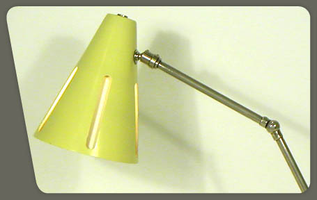 description : abat-jour orientable métallique laqué jaune perforé d'alvéoles et maintenu par un bras chromé muni de rotules, le tout s'appuyant sur un socle métallique laqué noir