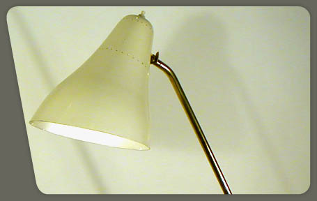 description : an off-white swivelling metal reflector on brass stem, a tripod base which can adjust the angle of the stem making the floor lamp a reading lamp