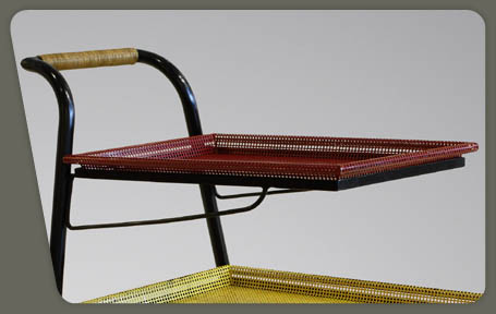 description : trays made of folded and perforated metal sheet, yellow and red top trays are movable, the rest of the black metal structure can be taken to pieces, handle covered with rattan.