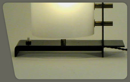 description : black lacquered metal base on which stands a tubular plexiglass shade, and a push botton switch on the front. Edited by EFA