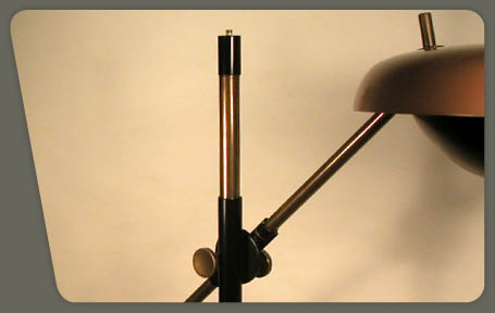 description : abat-jour en métal laqué marron, maintenu par un bras tubulaire en laiton coulissant dans un mécanisme de serrage laqué noir, lui-même coulissant sur un piètement vertical tubulaire en laiton, le tout sur un socle laqué marron, interrupteur sur le haut du pied central