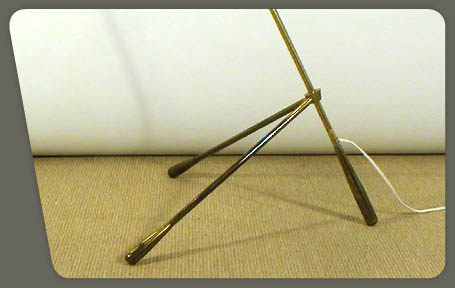 description : an off-white swivelling metal reflector on brass stem, a tripod base which can adjust the angle of the stem making the floor lamp a reading lamp