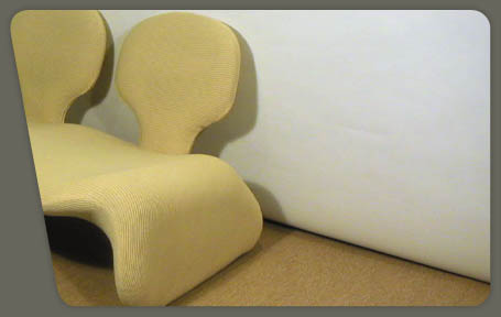 description : "Djinn series", bent tubular steel frame, covered polyurethane foam upholstered with ribbed off white jersey wool