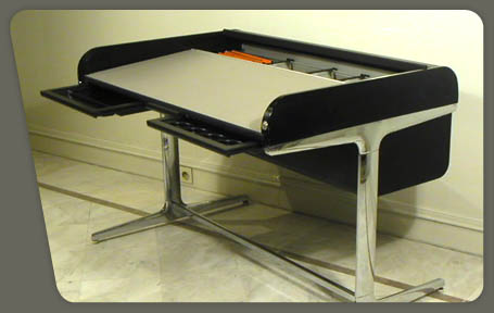 description : Action Office style/Rol Top Desk, black sides and chrome legs, black stained wood tambour top (partly rolled), grey laminated tray hiding 2 flat drawers beneath, Herman Miller Edition
