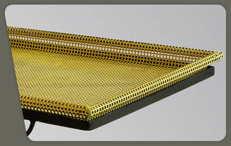 description : trays made of folded and perforated metal sheet, yellow and red top trays are movable, the rest of the black metal structure can be taken to pieces, handle covered with rattan.