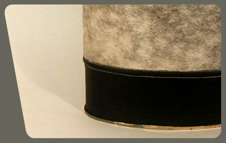 description : named "horse guard", made of metal covered with leatherette and foal skin, brass hoop on the top and bottom