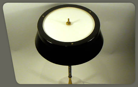 description : pied de lampe en laiton et laiton emaillé bleu, abat-jour en métal laqué noir, reflecteur supérieur en métal laqué blanc et diffuseur opalisé, socle de marbre. 3 positions d'éclairage commandées par un interrupteur en partie supérieure