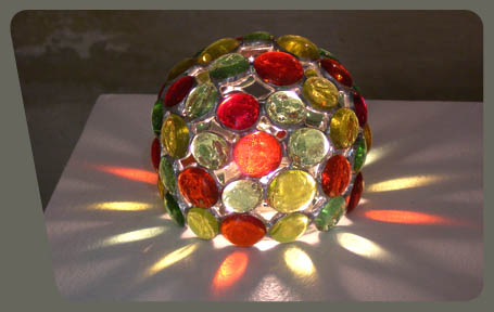 description : technic of the stained-glass window, the Photo-Dôme are photophores made of glass marbles and fixed together by tin soldering. A candle is put down in the center of a miror base.