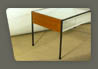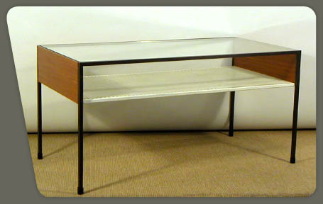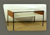 description : structure metallique en acier teinté noir, plateau de verre en partie supérieure avec coin arrondi, plateau metallique perforé teinté blanc, et côté en bois d'acajou