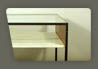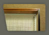 description : black steel frame holding a glass tray on the top cut to shape with round corners, beneath a perforated tray lacquered white and mahogany wood on each side