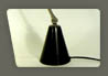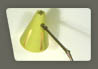 description : abat-jour orientable métallique laqué jaune perforé d'alvéoles et maintenu par un bras chromé muni de rotules, le tout s'appuyant sur un socle métallique laqué noir