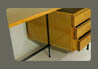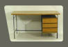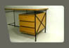 description : plateau et caisson à 3 tiroirs en placage de frêne verni soutenu par une structure métallique tubulaire noire